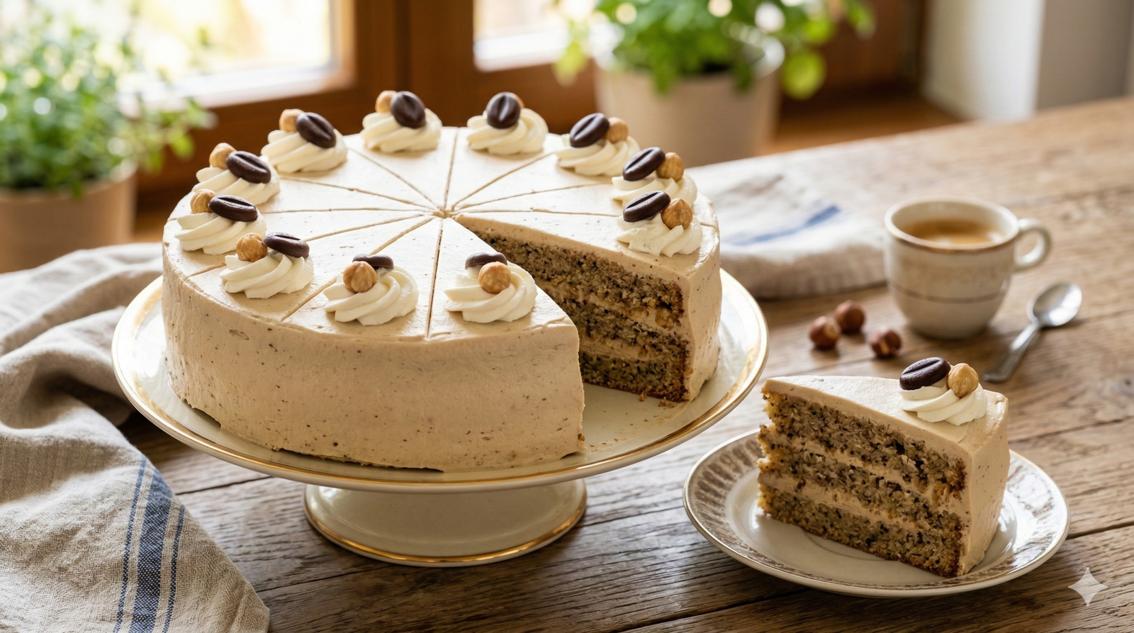 Se ami i sapori decisi e i dolci eleganti, la Torta di nocciole al caffè è un vero capolavoro di pasticceria da replicare a casa. Questa torta spettacolare è composta da tre dischi di morbida pasta alle nocciole tostate, farciti con una ricca e vellutata crema al caffè e panna.