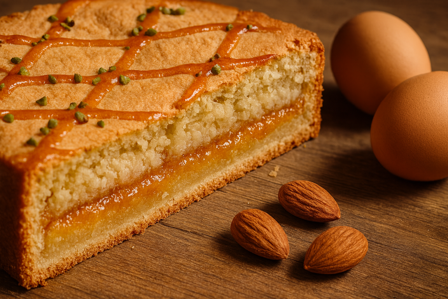 Un dolce di origini francesi di grande raffinatezza, con base di pasta frolla friabile, morbida crema alle mandorle e meringaggio dorato, completata da glassa di marmellata di albicocche e pistacchi