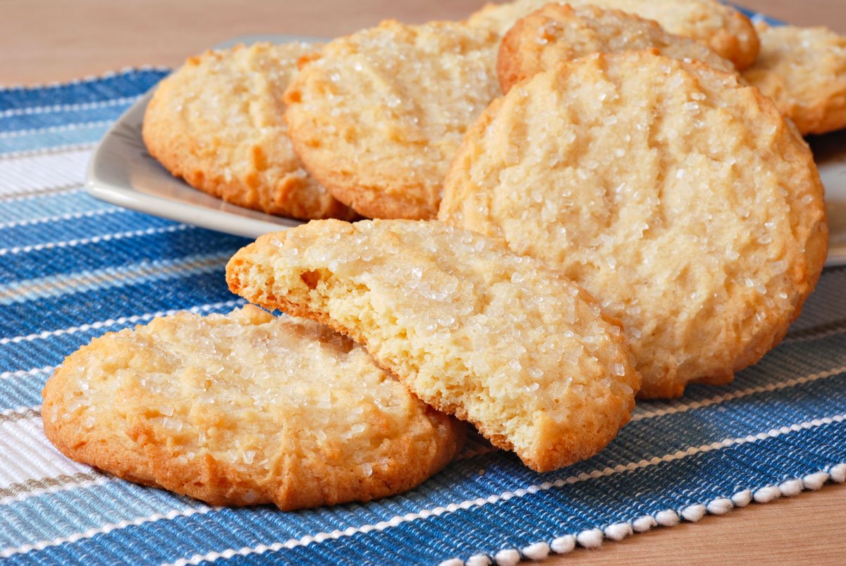 Disponete i biscotti su una teglia rivestita con carta da forno, lasciando un po’ di spazio tra l’uno e l’altro. Cospargete la superficie con abbondante granella di zucchero per ottenere una doratura croccante.