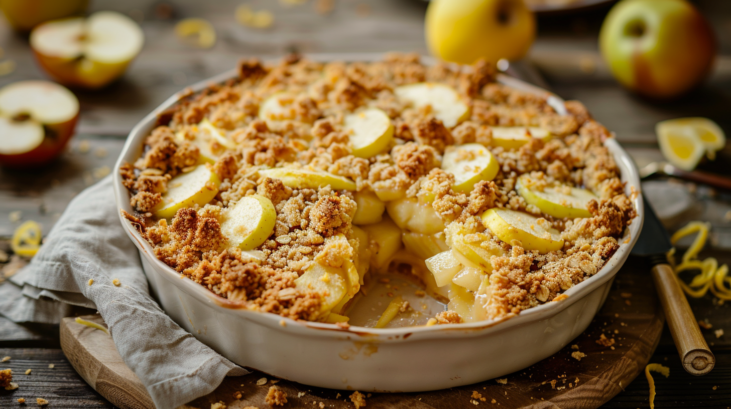 5. Completate e cuocete: Distribuite il crumble uniformemente sulla superficie delle mele, coprendole completamente. Infornate nel ripiano centrale del forno per 25-30 minuti, fino a quando il crumble risulterà dorato e croccante.