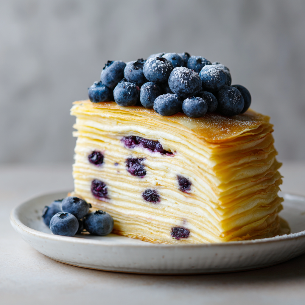 Questa torta di crêpes ai mirtilli è ispirata alla celebre Mille Crêpe Cake giapponese, un dolce raffinato e scenografico che ha spopolato nei cafè di Tokyo. A differenza delle classiche crêpes occidentali, in Giappone vengono sovrapposte per creare una torta a strati elegante e sorprendente.