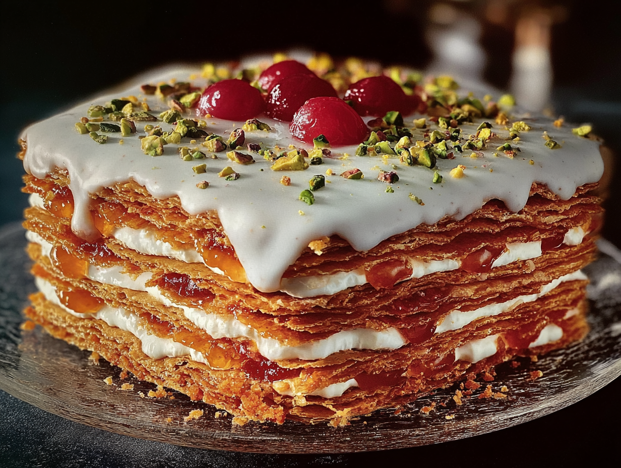 Torta millefoglie con pasta sfoglia croccante, crema chantilly e glassa bianca. Perfetta per occasioni speciali