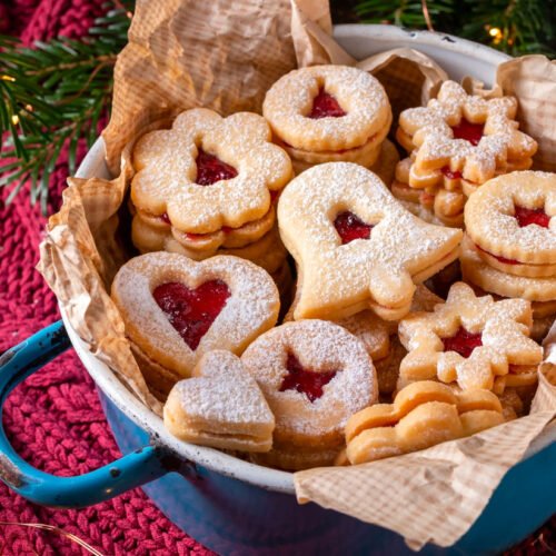Lasciate raffreddare completamente i biscotti. Distribuite uno strato generoso di marmellata sui biscotti senza foro. Chiudete ogni biscotto con quelli che hanno il foro centrale, premendo leggermente