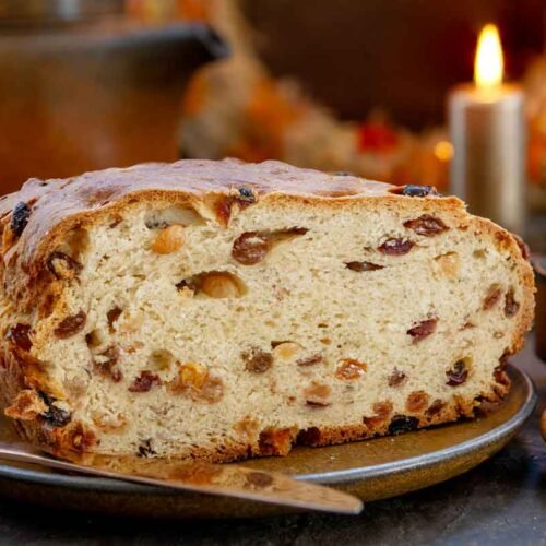 Coprite l'impasto con un canovaccio pulito e lasciatelo riposare per altri 15 minuti. Nel frattempo, ammorbidite l'uvetta sultanina in acqua tiepida per 10 minuti, poi scolatela e strizzatela bene. Incorporate delicatamente l'uvetta nell'impasto lievitato.