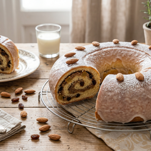 Preparate la glassa mescolando 100g di zucchero a velo con l'albume e 1 cucchiaio di acqua di rose. Spalmatela sulla ciambella ancora tiepida.
